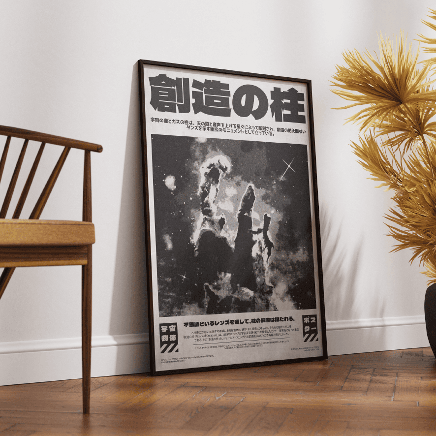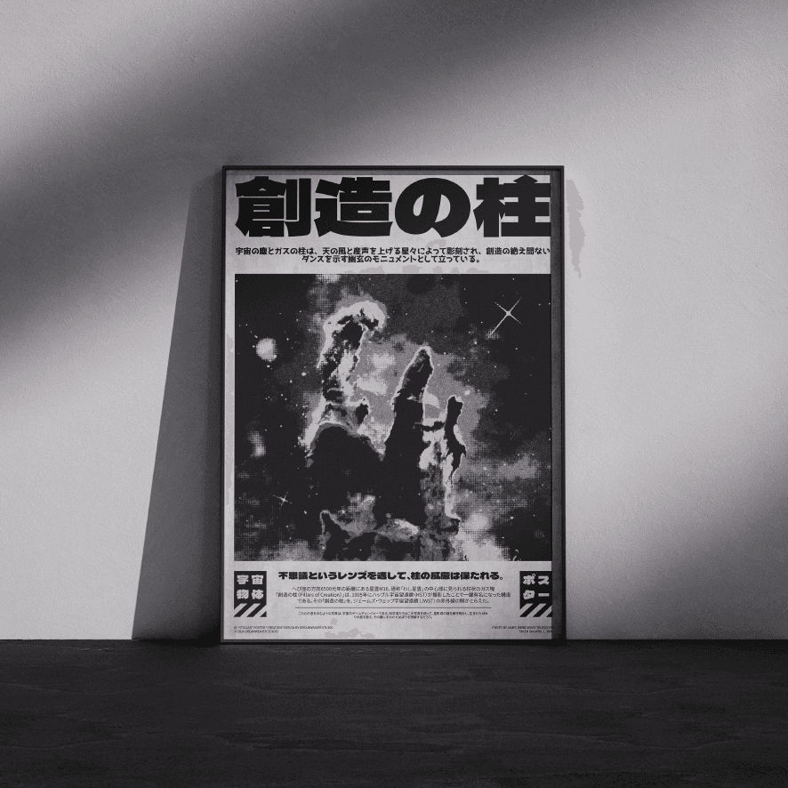 This poster captures Pillars of Creation, a towering nebula structure observed through brutalist sci-fi aesthetics and retro-Japanese styling.