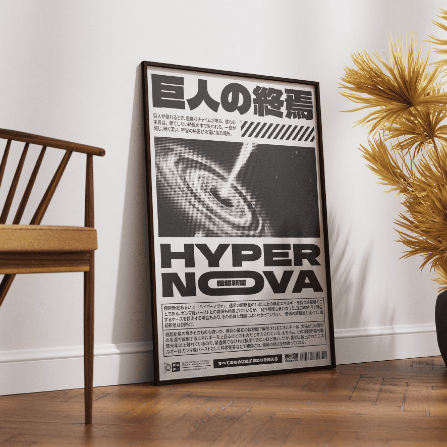This poster explores the Hypernova phenomenon through brutalist sci-fi aesthetics and retro-Japanese styling.